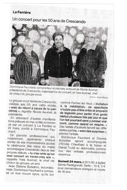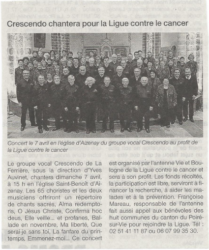 La Roche-sur-Yon – Un concert du Groupe Vocal Crescendo le dimanche 8 mars 2020 (Courrier de l’Ouest)