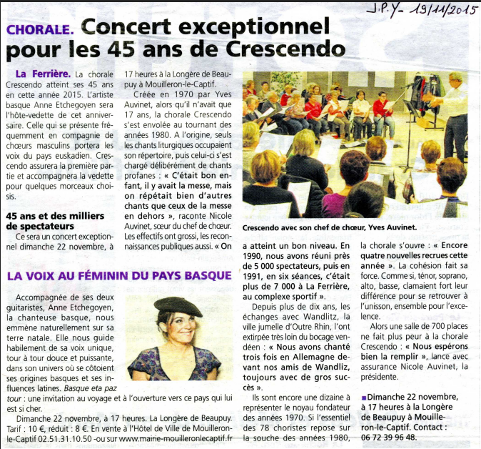 La Ferrière – Concert exceptionnel pour les 45 ans de Crescendo (Journal du Pays Yonnais du 19 novembre 2015)